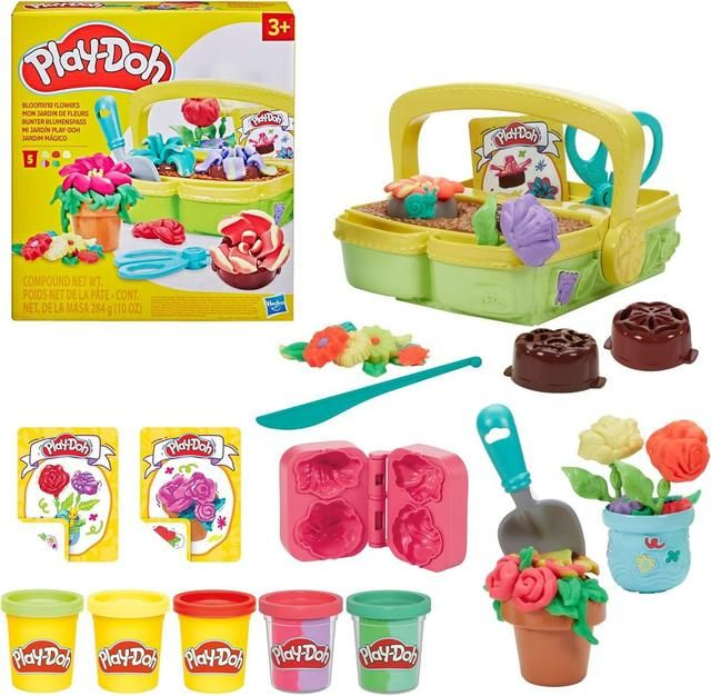 Let imaginations blossom with the Play-Doh Blooming Flowers kids playset! This indoor garden toy is ready for any season with fun ways to play pretend florist year-round. The garden box and flower pucks can make 4 different Play-Doh flower shapes and the book-mold creates 2 more varieties. Display and hold the blossoms and stems in place with the flower pot and vase. 5 Play-Doh cans and 3 how-to cards help spark their imaginations with this sensory toy. Give a gift for kids 3 and up that helps their creativity bloom! PLAY-DOH and HASBRO and all related trademarks and logos are trademarks of Hasbro, Inc. Includes garden box, 4 flower pucks, 3 stems, flower book-mold, vase, flower pot, trowel, shears, knife, 3 creation cards, and 5 cans of Play-Doh Brand Modeling Compound (total 10 ounces/284 grams).